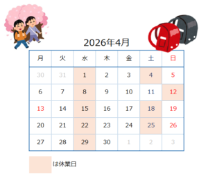 ※4月11日(土)は営業、12日(日)はお休みとなります。